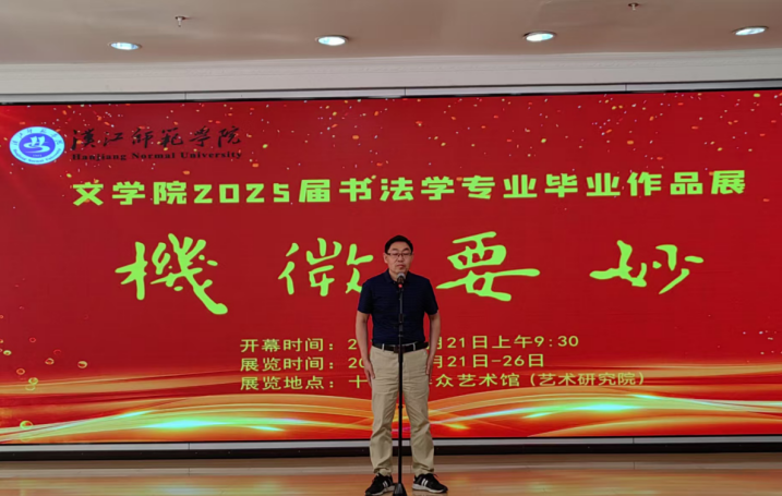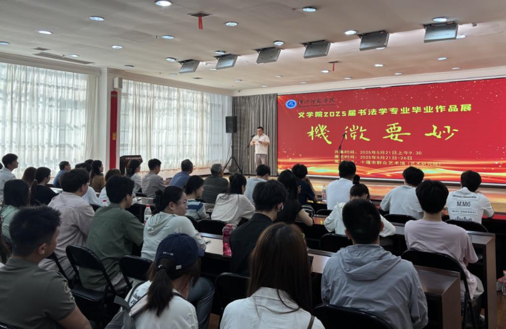 5月21日上午,汉江师范学院文学院书法学专业2025届毕业作品展在十堰市群众艺术馆隆重举行。文学院分党委书记曹弋、十堰市群众艺术馆馆长袁昌、十堰市文化和旅游局群众文化科负责人罗媛等出席活动,书法学专业闻博老师主持开幕式。