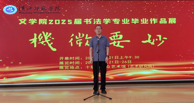 开幕式上,汉江师范学院书法学专业带头人曹国军教授致辞。在致辞中,曹教授向来宾介绍了汉师书法学专业的办学思路与愿景,曹教授表示,此次展览是书法学专业教学成果的集中展示,也是校地协同育人的重要实践,他感谢市群艺馆为师生提供展示平台,并强调学院将持续深化与地方文化机构的合作,助力十堰文化事业高质量发展。