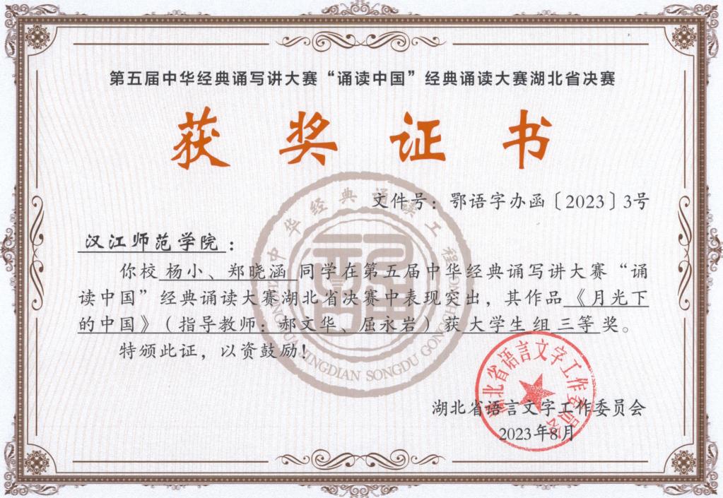 近日,由湖北省语言文字工作委员会、湖北省教育厅主办的第五届中华经典诵写讲大赛“诵读中国”经典诵读大赛落下帷幕,文学院师生取得优异成绩。