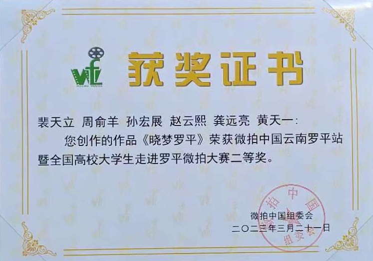 近日,在微拍中国云南罗平站暨全国高校大学生走进罗平微拍大赛中,文学院2022届广播电视编导专业学生裴天立、周俞羊、孙宏展、龚远亮获得大赛二等奖。
