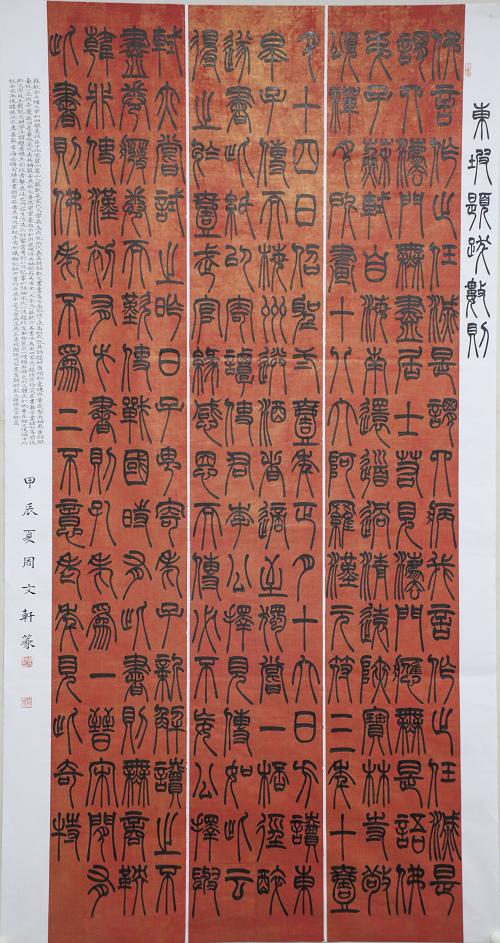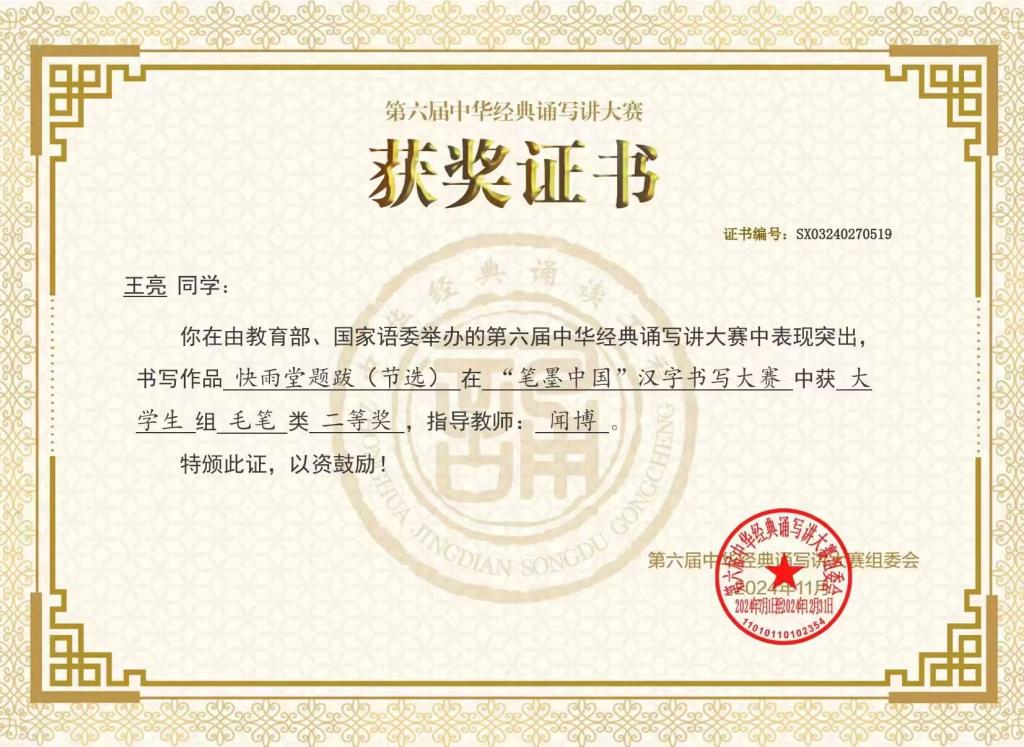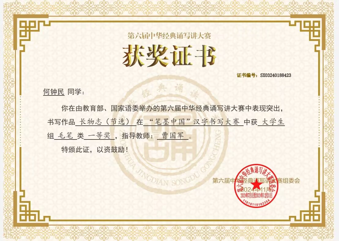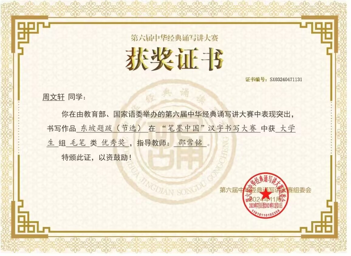 近日,由教育部、国家语委主办的第六届中华经典诵写讲大赛大赛公示了拟获奖作品名单,文学院学生取得优异成绩。由曹国军老师指导的书法学专业21级何钟民同学作品《长物志(节选)》获大学生组毛笔一等奖;由闻博老师指导的书法学专业21级王亮同学作品《快雨堂题跋(节选)》获大学生组毛笔二等奖,由邵常铭老师指导的书法学专业23级周文轩同学作品《东坡题跋(节选)》获大学生组毛笔优秀奖。