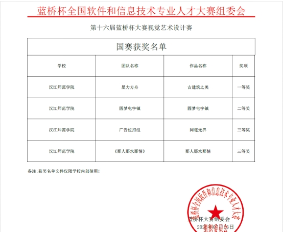 在刚刚落幕的第十六届蓝桥杯全国软件和信息技术专业人才大赛视觉艺术设计赛全国总决赛中,汉江师范学院荣获国赛一等奖1项,国赛二等奖1项,国赛三等奖2项。其中教育学院张磊老师指导,学生张婷婷创作的《古建筑之美》脱颖而出,以第一名斩获海报设计—静态海报(命题)全国总决赛一等奖。这是我校在该赛事视觉艺术设计赛项中首次摘得全国一等奖,实现了历史性突破。文学院杨思宇老师指导的《圆梦屯子镇》获国赛二等奖,杨思宇老师指导的《广告位招租》和郭成指导作品《那人那水那情》获三等奖。