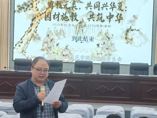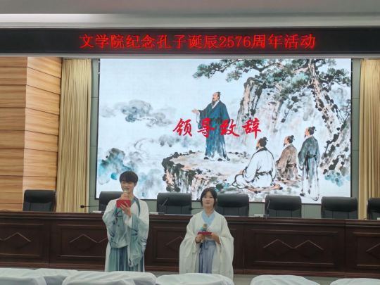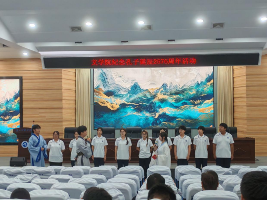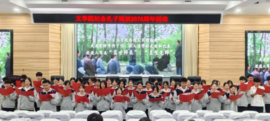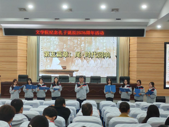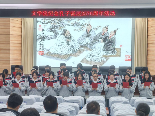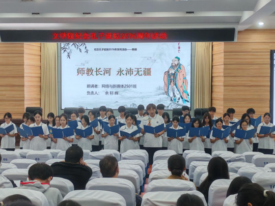 桂香馥郁沁心脾, 2025年9月28日晚七点,文学院在崇文楼C101开展了孔子诞辰2576周年纪念活动。本次活动以诗朗诵的形式进行,不仅让大家重温了孔子思想,还传承了与弘扬中华优秀传统文化。汉语言文学专业负责人王艳老师,2025级四年制本科新生班主任老师龚道臻、闻博、叶子微,张鑫泽,李芳瑶老师,以及院学工办主任魏东老师出席了本次活动,参加活动的还有全体25级参与表演的新生。